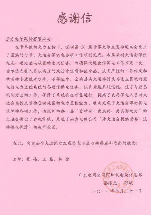 8月23日,世界大学生运动会在深圳圆满落幕,成都心陈之约科技有限公司作为大运会唯一保电企业见证了世界大学生体育运动的蓬勃发展。成都心陈之约科技有限公司技术中心系统部与工程部坚守“忠于职守,全力以赴,誓保大运电网安全”的信念,联手实现了大运保供电期间系统零故障、零缺陷的目标。